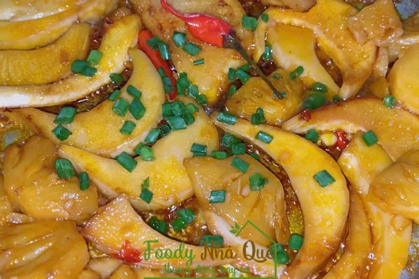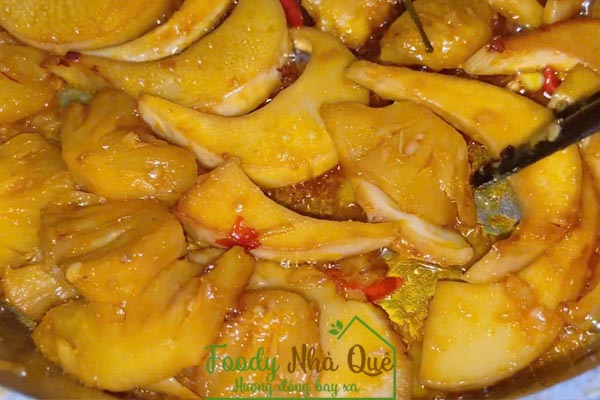 Chúng ta kho ở mức lửa vừa, tầm 30p nồi cạn nước sẽ tiếp tục cho thêm một ít nước màu điều vào, gia thêm nước và tiếp tục kho lần 2. Cũng kho ở mức lửa vừa đến khi cạn nước. Món củ hủ dừa kho thơm này Foody Nhà Quê thường kho cháy xém một chút thì cảm giác sẽ ngon hơn, củ hủ dừa và thơm keo lại, thơm phưng phức, ăn một mạch mấy chén cơm liền. Có thể cho thêm một ít hành thái mỏng để món ăn thêm bắt mắt.
